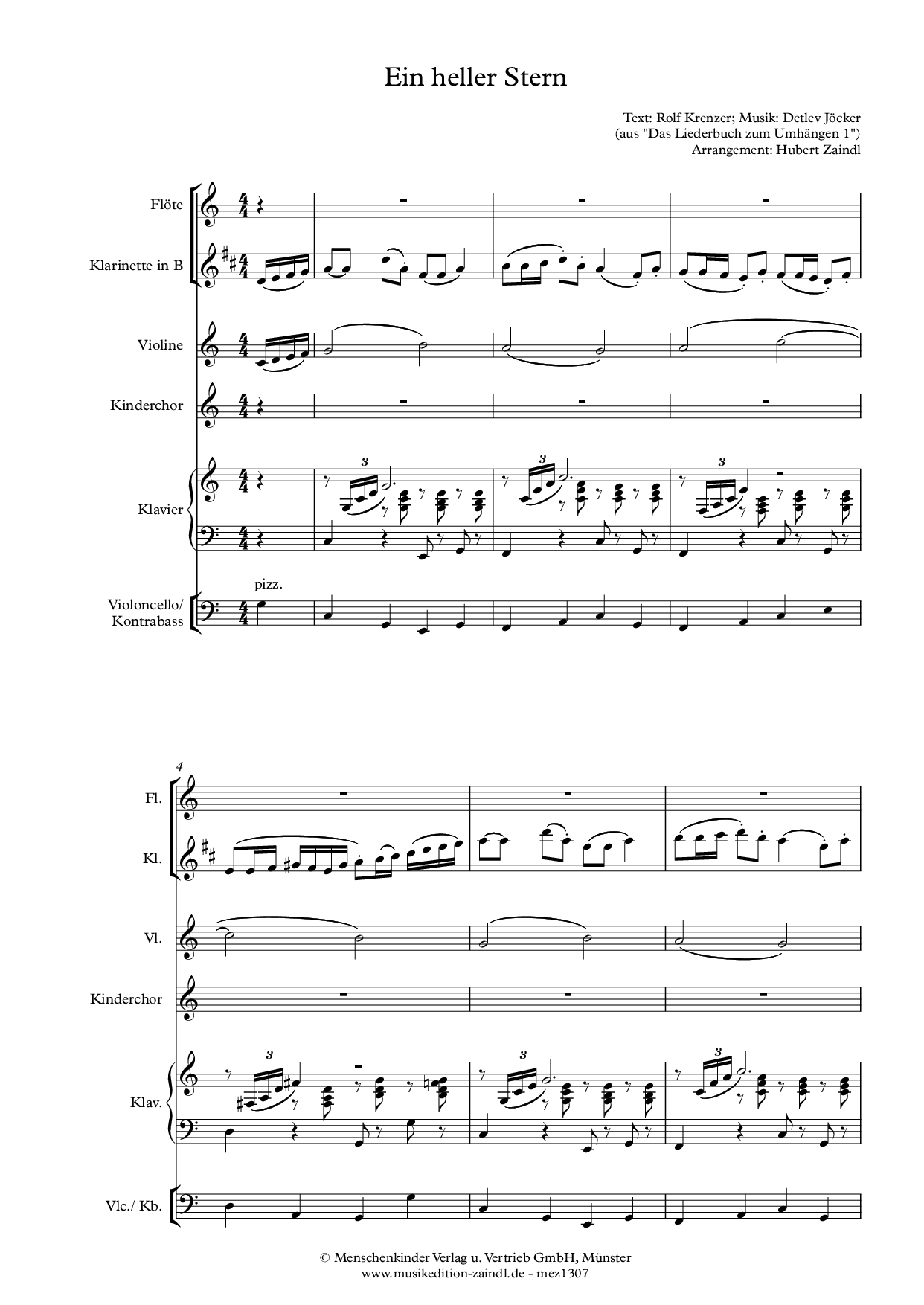 Besetzung: einstimmiger Kinderchor, Flöte, Oboe, Trompete I+II, Posaune, Claves, Conga, Glockenspiel, Klavier, Violine I, Violine II, Viola, Violoncello, Kontrabass